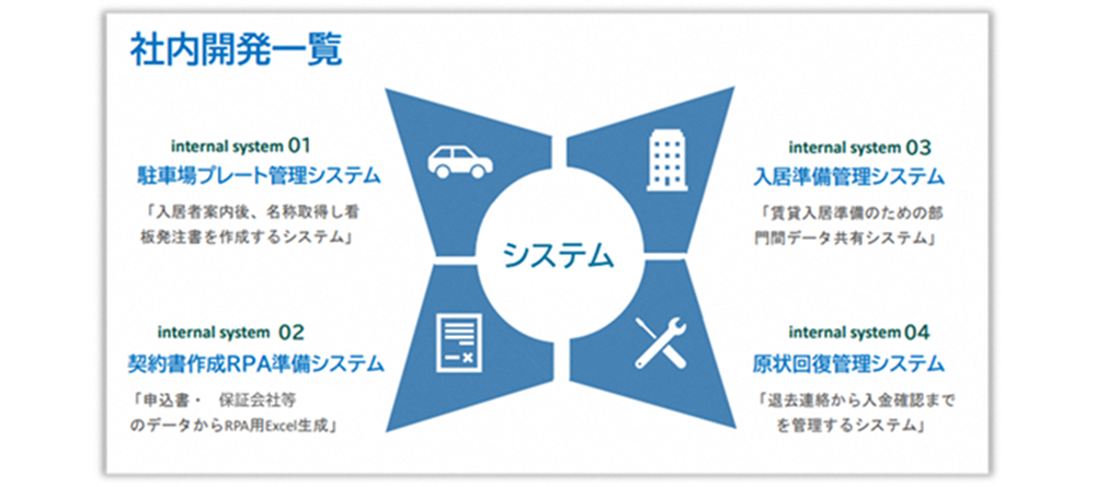 システム開発の内製化にも積極的に取組んでおり、「Microsoft Access」※を利用して、社内の開発者を中心に現場の要望を迅速に反映した業務改善ツールを構築しています。「Microsoft Access」※とは、Microsoft社が提供するデータベース管理ソフトで、比較的短期間で柔軟に業務システムを開発できるのが特徴です。例えば、入居準備管理システムや原状回復管理システム、駐車場プレート管理、契約書作成RPA準備など、現場の課題に即したシステムを自社開発することで、外部ベンダーへの依存を減らし、コスト削減と業務改善のスピード向上を両立しています。