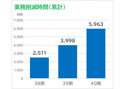 DX推進による最大のメリットは、業務効率化による大幅な時間削減です。RPAや内製システム、モバイルアプリの導入によって、従来は多くの人手と時間を要していた定型業務が自動化されました。DX推進開始から3年間で、RPAやAccessシステムなどの新規開発・アップグレードは合計185件にのぼり、これらの取組みによる業務削減時間は累計5,963時間に達しています。